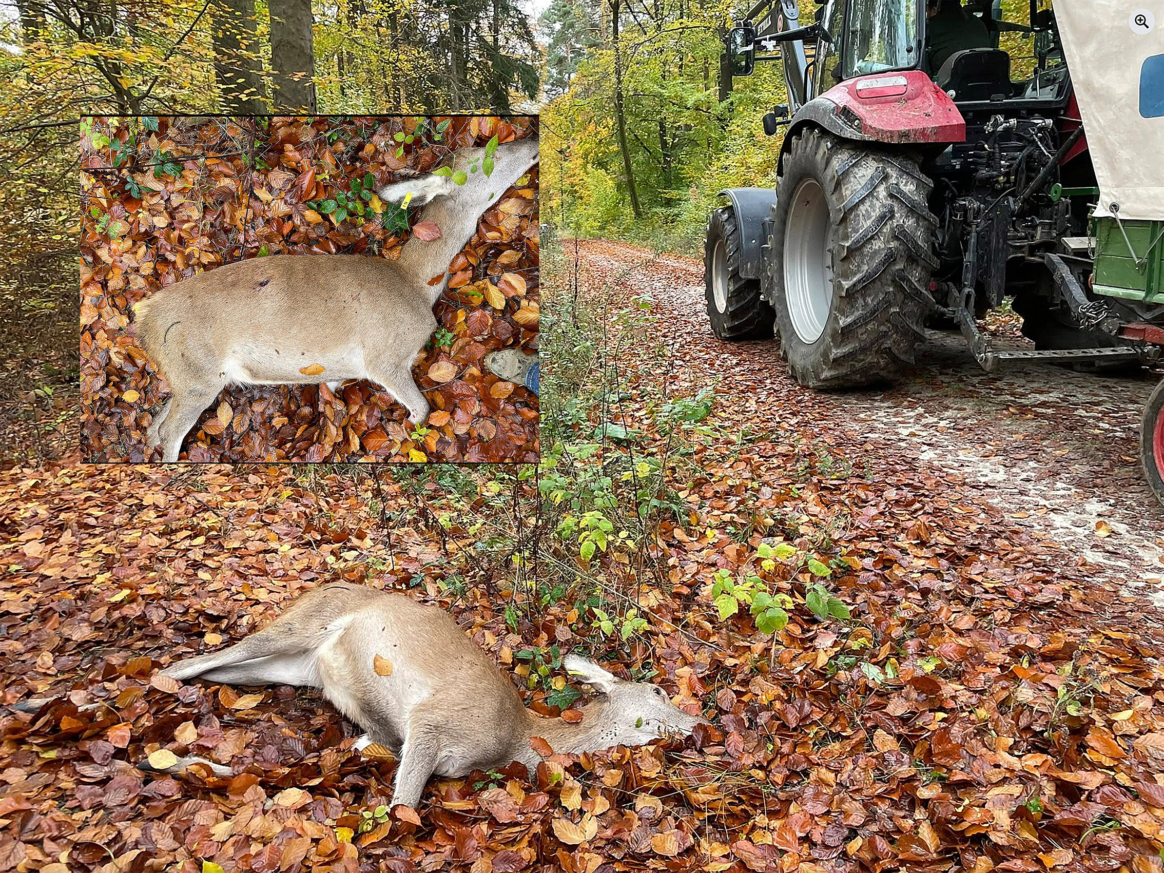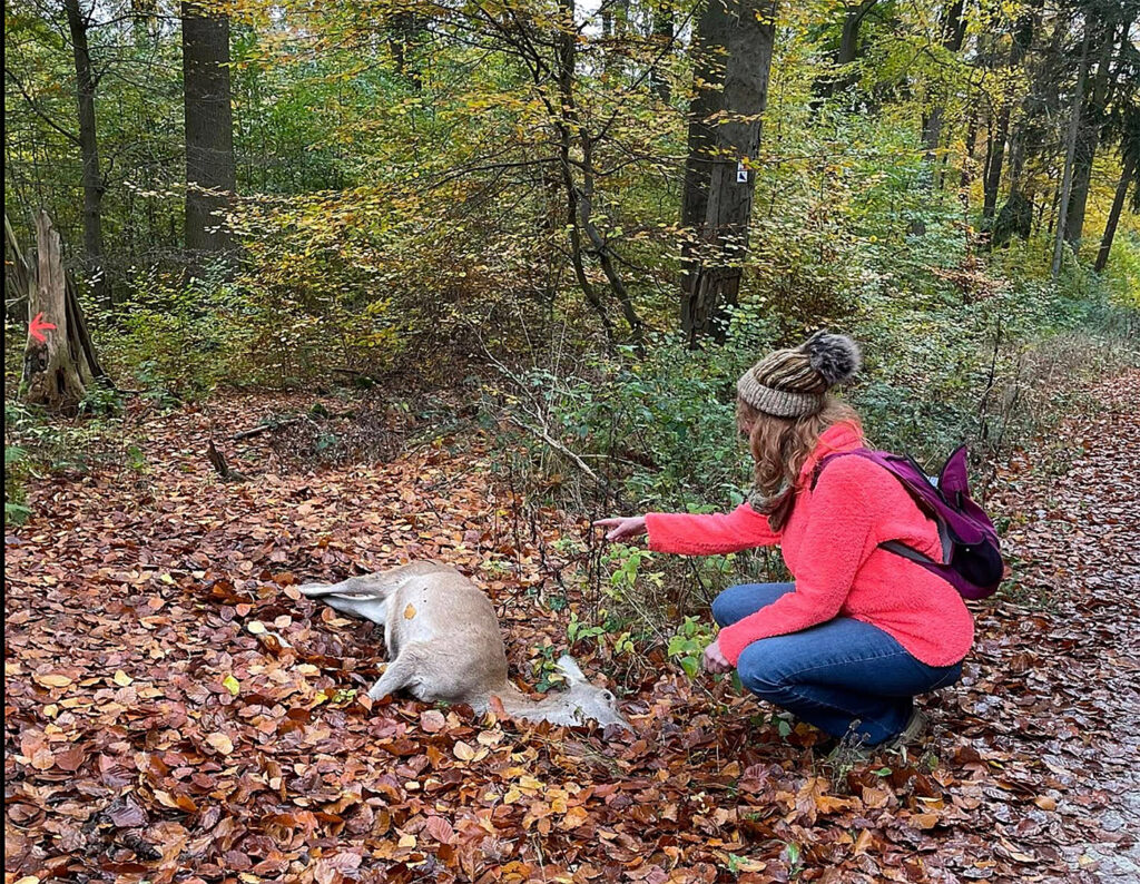 Am Wegesrand lag eine Hirschkuh. Ein tiefer Bauchschuss. Sie war nicht sofort tot. Das Blut am Maul, die Schwellung am oberen Rand des Körpers – alles sprach dafür, dass sie lange gelitten hatte, bevor der Tod eintrat. Ein Bild, das sich einbrennt. Ein Beweis dafür, was Drückjagden wirklich anrichten: unnötiges, langes Leiden.