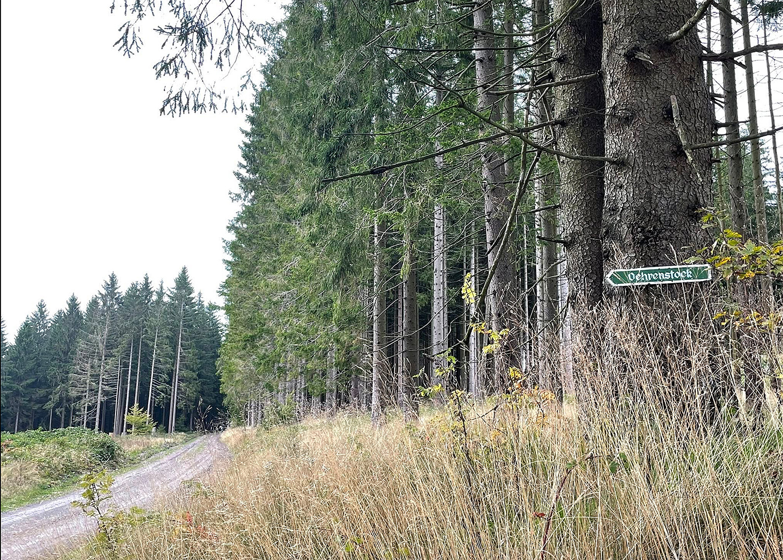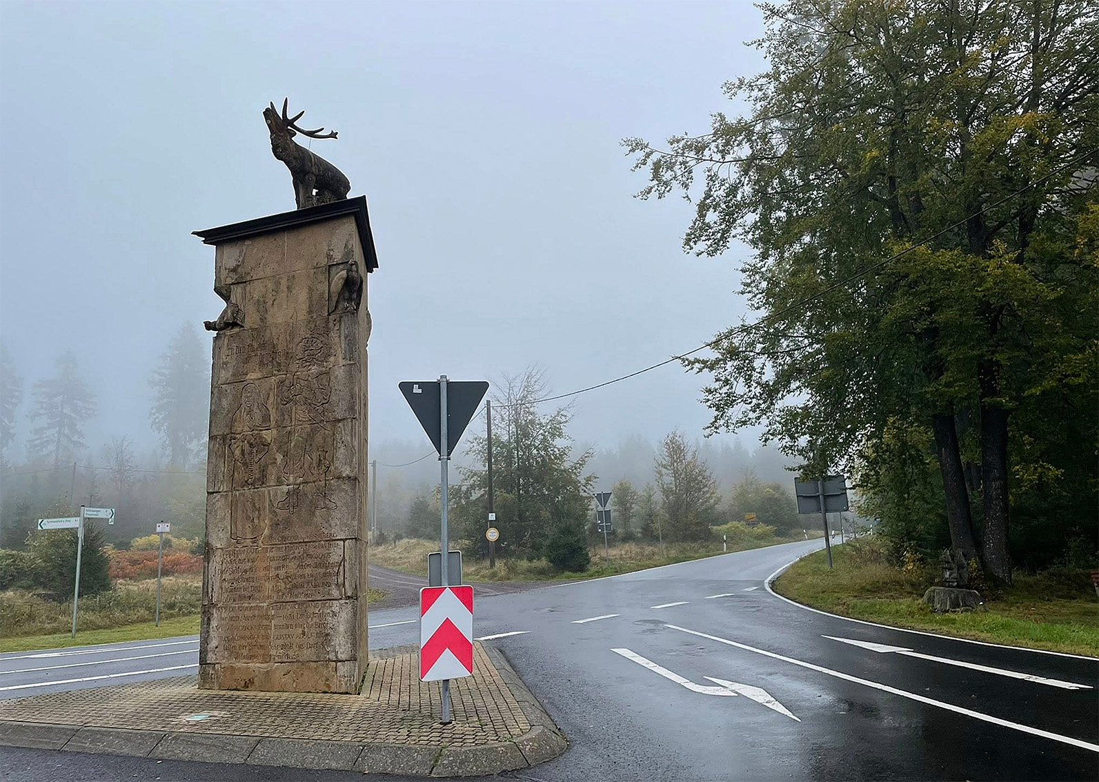 Dreiherrenstein am 19.11.25  Der Große Dreiherrenstein (ca. 820 m ü. NN) im Thüringer Wald ist ein zentraler Knotenpunkt des berühmten Rennsteigs und liegt im Biosphärenreservat Vessertal-Thüringer Wald. Er verbindet historische Grenzsteine mit modernen Wanderwegen und bietet Zugang zu einem dichten Netz aus markierten Pfaden.  Basierend auf offiziellen Wanderportalen und Apps wie AllTrails, GPS Wanderatlas und lokalen Tourismusseiten (Stand November 2025) umfasst das unmittelbare Umfeld  ca. 50–60 km an markierten Wegen, die den Dreiherrenstein als Ausgangspunkt nutzen. Der Großteil davon ist Teil des Rennsteigs (insgesamt 170 km lang), dessen Etappen hier kreuzen. Er gehört zum Kerngebiet des Neustädter Rudels.  Foto: privat