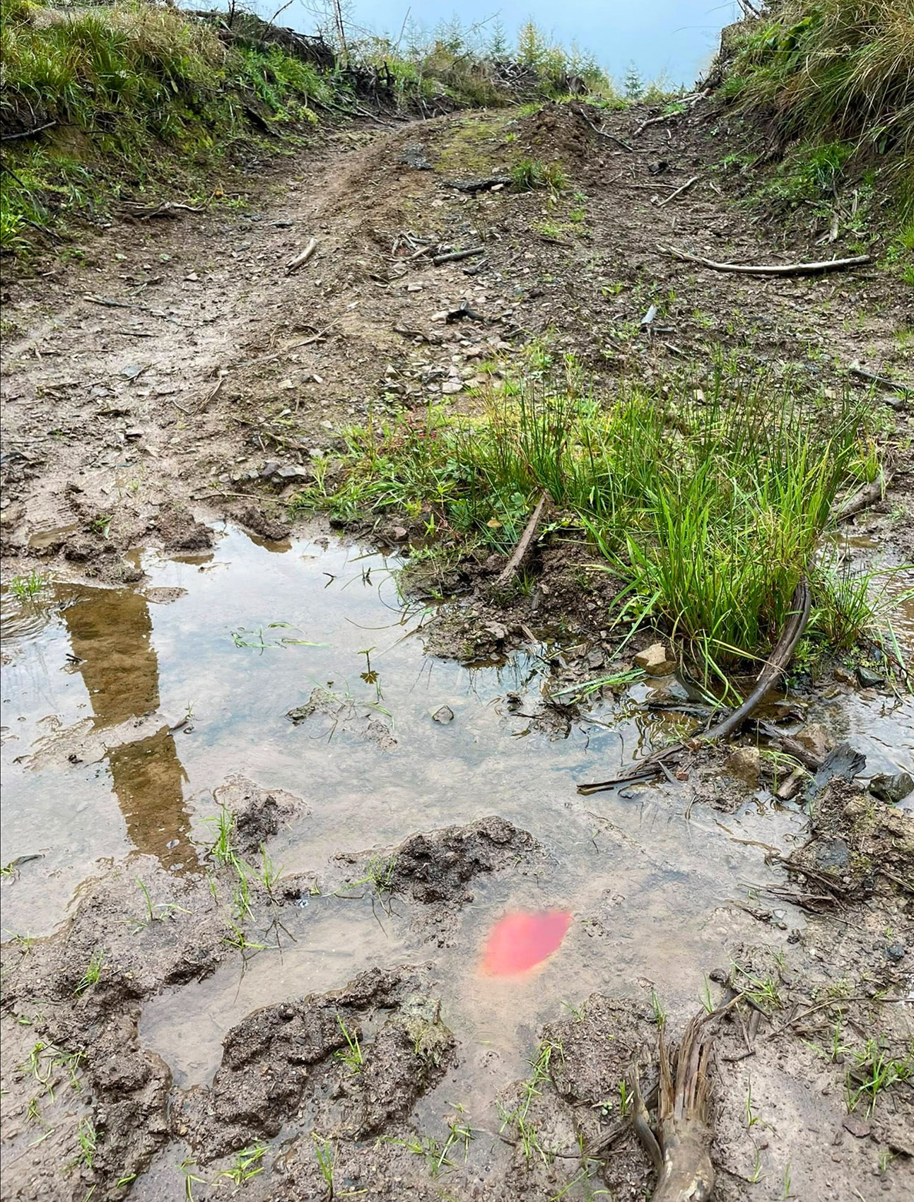• Eine Blutlache in einer Pfütze direkt neben einem markierten Baum – eindeutig frisch und in einer Menge, die auf ein erlegtes oder angeschossenes Stück Schwarzwild oder Rotwild hinweist.