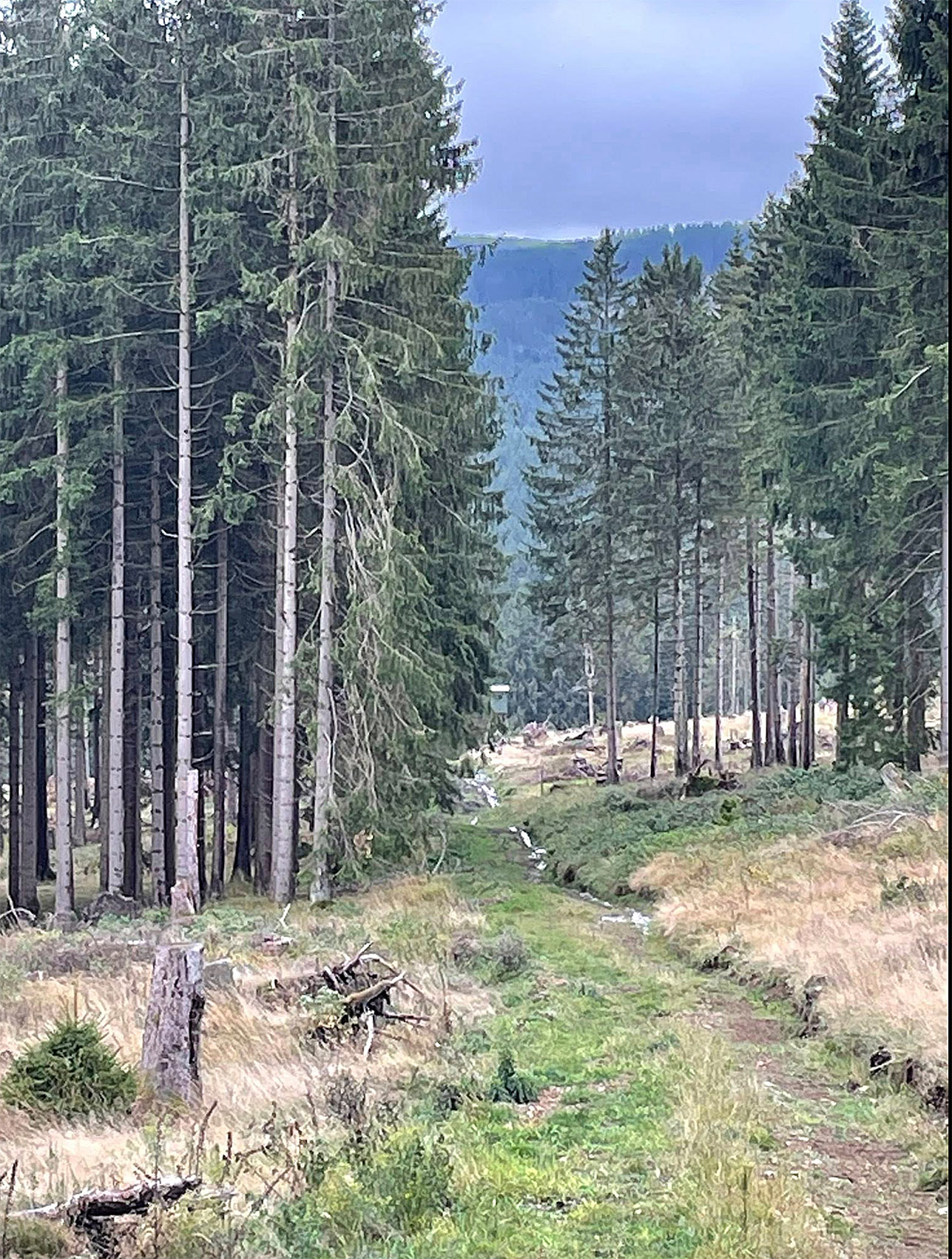 • Schwere Harvester und Rückezüge, die tiefe Spurrinnen in den weichen Waldboden zogen und ganze Hanglagen zerschnitten.