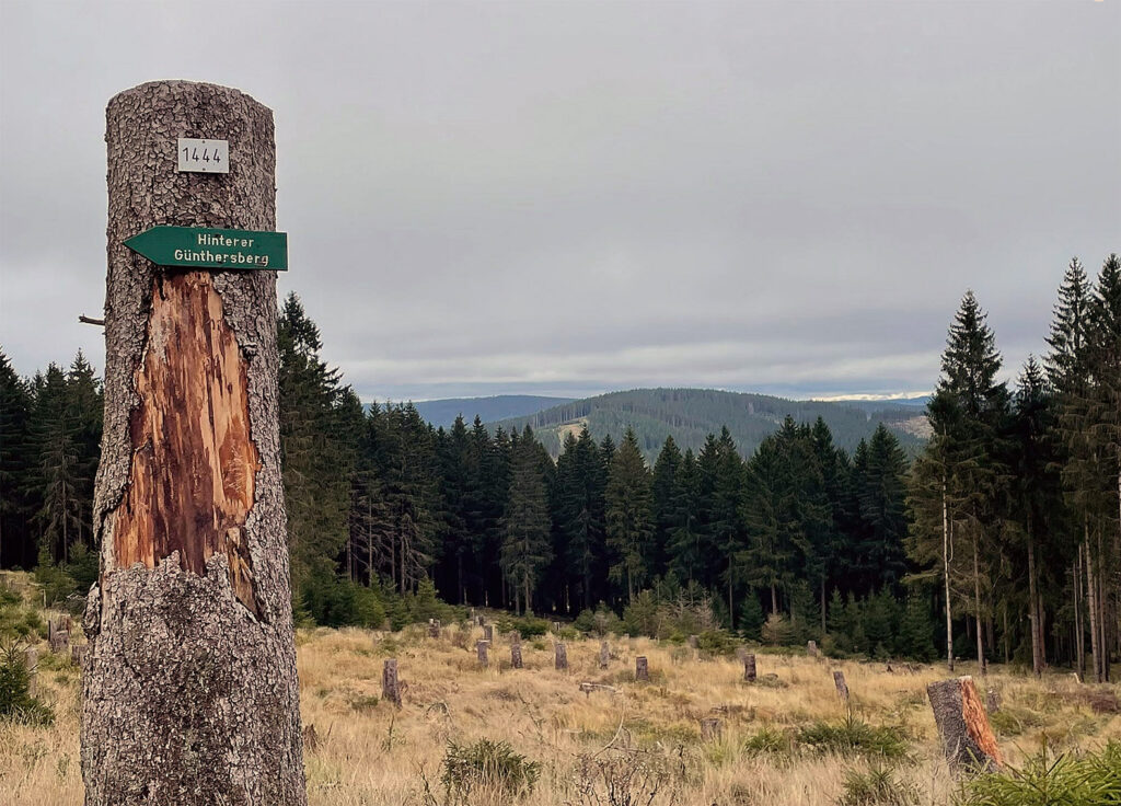 • Frische Stümpfe von Bäumen mit 70–90 cm Durchmesser, die eindeutig nicht vom Borkenkäfer geschädigt waren.