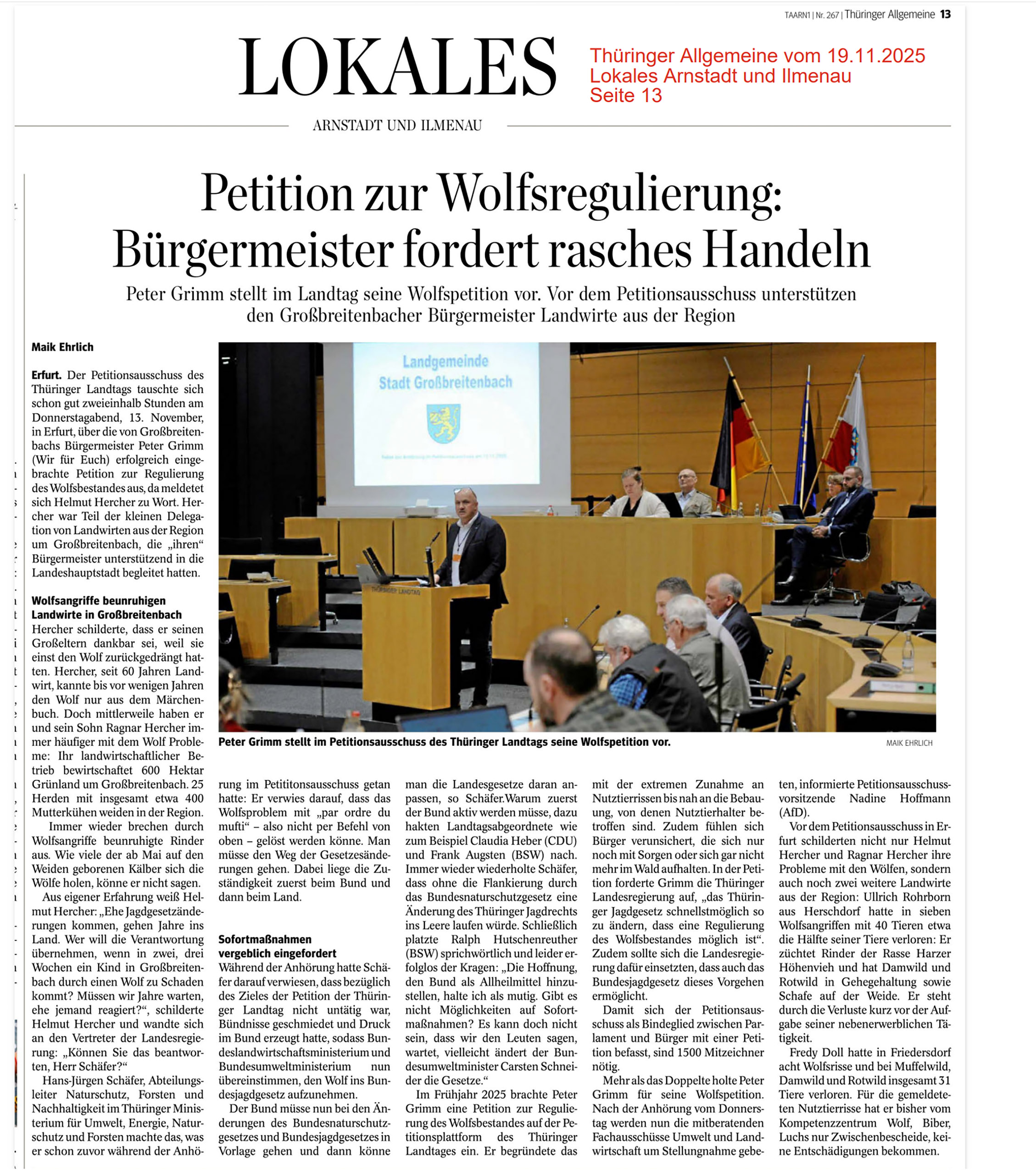 Im Freien Wort erschien ein Artikel, in dem der Thüringer Staatskanzleichef Stefan Gruhner (CDU) behauptet, dass in Deutschland 3.300 „erwachsene“ Wölfe leben würden. Das Blatt hat eine Auflage von fast 40.000 Exemplaren.  Hier die Wirklichkeit  https://wolfsschutz-deutschland.de/2025/11/14/wolfsmonitoring-2024-25-die-offiziellen-zahlen-beweisen-der-guenstige-erhaltungszustand-ist-nicht-erreicht/