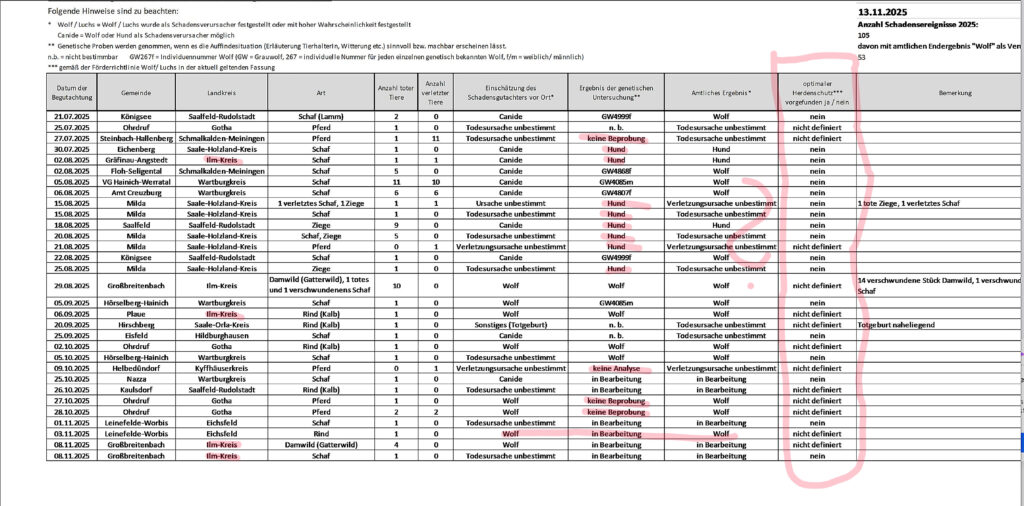 Aktueller Auszug aus der Rissliste. Auch seit Sommer ist immer noch kein einziges Tier geschützt gewesen. Auch „nicht definiert“ ist nicht geschützt. Dazu gibt es etliche Widersprüche, bei Hunderissen lautet das Ergebnis „Todesursache unbestimmt“. Quelle: https://umwelt.thueringen.de/fileadmin/001_TMUEN/Unsere_Themen/Natur_Artenschutz/Wolf_Luchs_Biber/Schadenereignisse/Schadenstabelle_Nutztiere.pdf