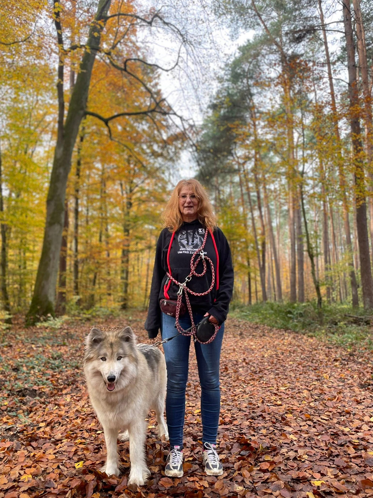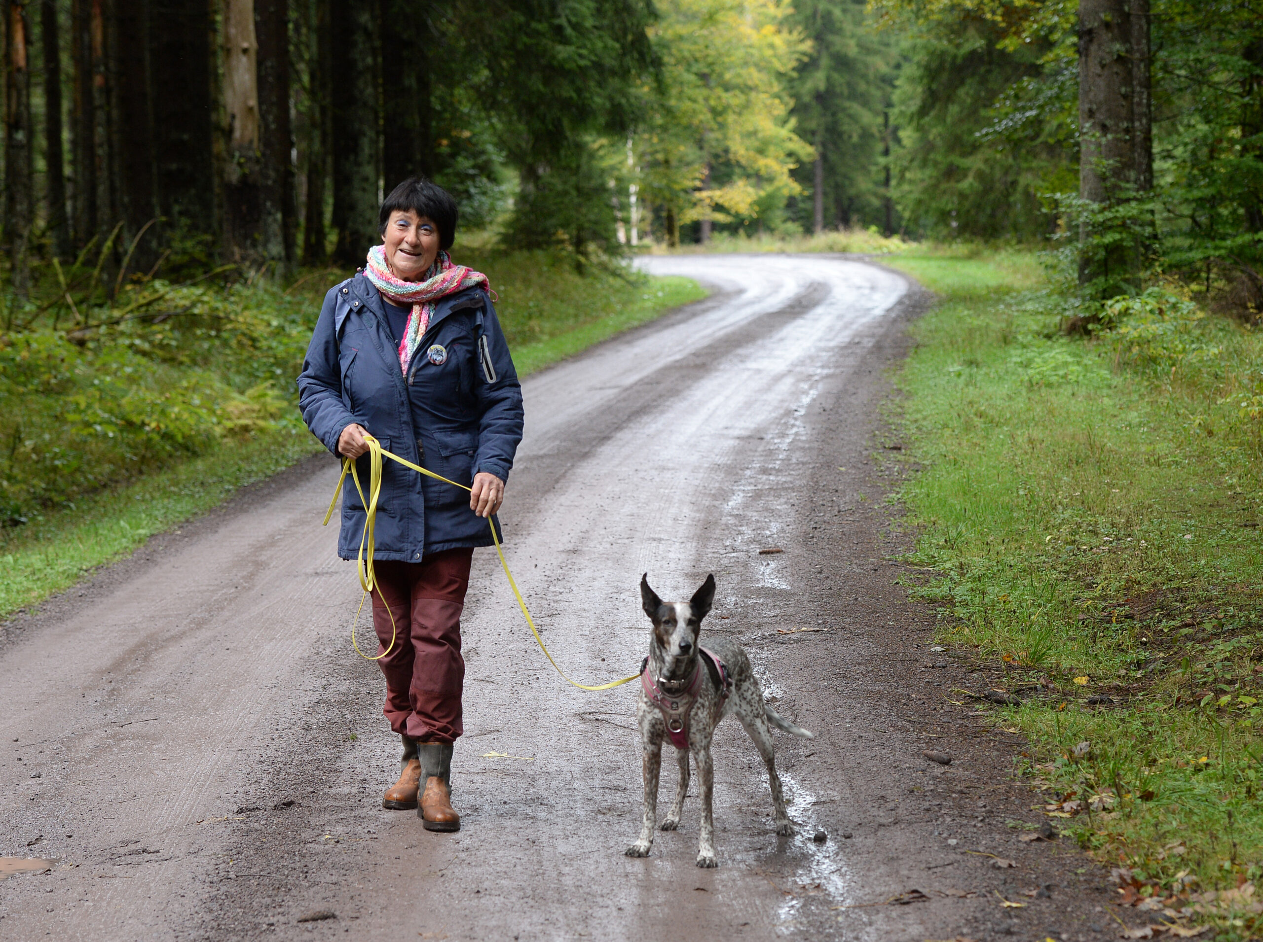 Gudrun mit Alba, die Wolfslosung und Wolfsgeruch in der Umgebung erkennt. © Brigitte Sommer