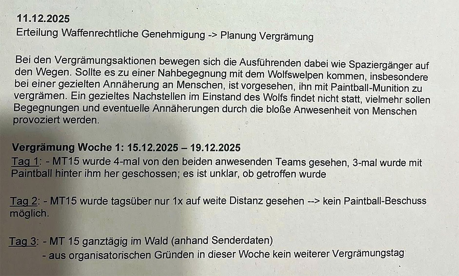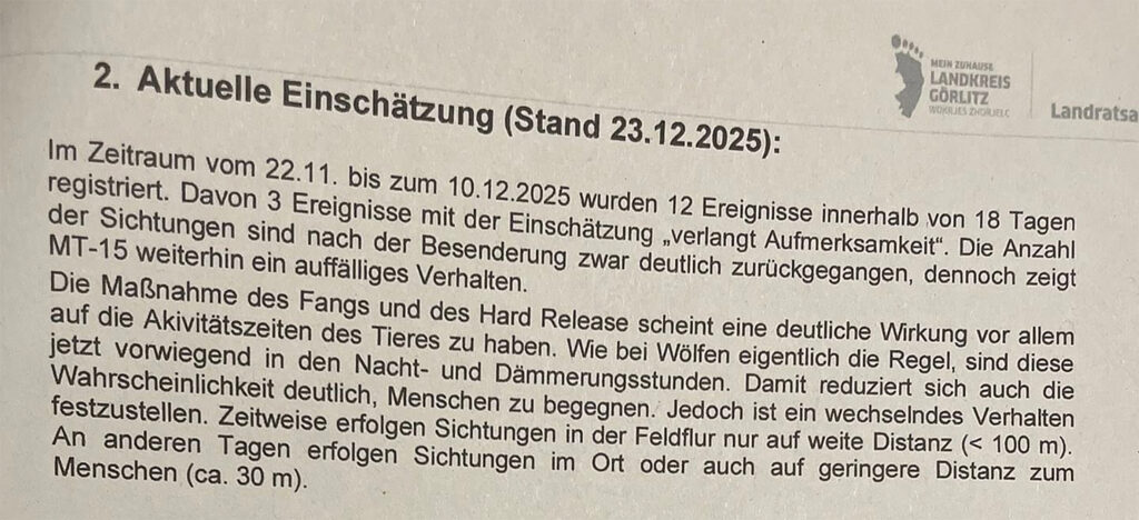 Eine UIG-Anfrage von uns (Antwort vom 23. Dezember 2025) liefert die Fakten, die eine völlig andere Interpretation zulassen. In den ersten 18 Tagen nach der Hard-Release-Aktion (22.11.–10.12.2025) wurden 12 Sichtungen registriert, davon 3 mit „verlangt Aufmerksamkeit“, teilweise auf nur 30 Meter Distanz im Ort. Das Verhalten blieb wechselnd – mal waldbezogen und dämmerungsaktiv, mal wieder in der Feldflur oder nah an Menschen. Kein klarer Erfolg. Der echte Durchbruch kam erst später: Vom 15. bis 19. Dezember wurde MT15 viermal mit Paintball-Munition beschossen. Erst diese sichtbare, gezielte und mit Fluchtmöglichkeit verbundene Nachvergrämung brachte die gewünschte Scheu. Vergleicht man die 19 Annäherungen vor der Maßnahme mit den 12 Sichtungen danach, ergibt sich bis dahin ein fast identisches Muster – erst die Paintball-Kugeln veränderten das Verhalten nachhaltig.