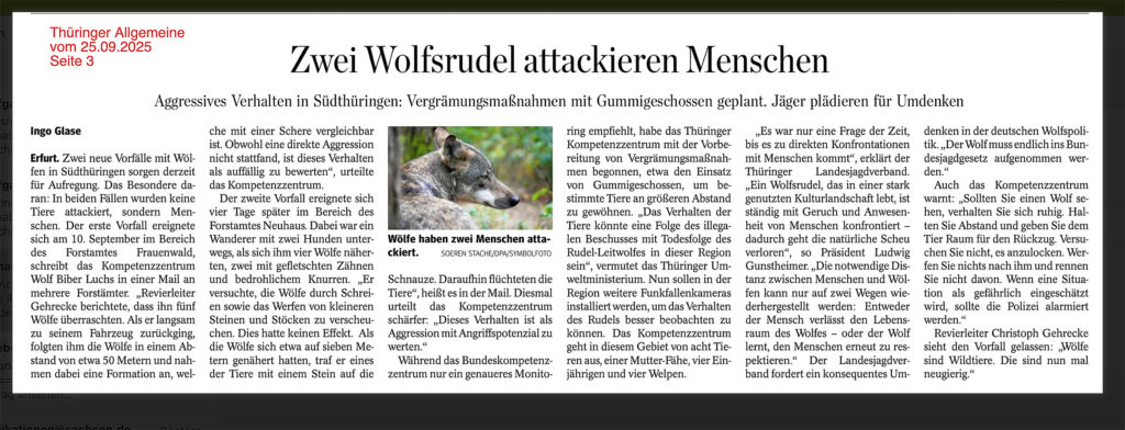 Nein, es gab keinen Angriff auf Menschen. Wolfsschutz-Deutschland e. V. verurteilt die einseitige und tendenziöse Berichterstattung der Thüringer Allgemeinen zum Thema „Zwei Wolfsrudel attackieren Menschen“ (Ausgabe 25./26. September 2025) aufs Schärfste. Schon in der Headline ist eine falsche Tatsachenbehauptung, der ganze Artikel ist zudem alarmistisch und verdreht die Realität zugunsten einer Wolfspanikmache, die weder wissenschaftlich noch ethisch haltbar ist. Es ist an der Zeit, die Fakten klarzustellen und die Verantwortung der Medien sowie der Politik in Thüringen zu hinterfragen.