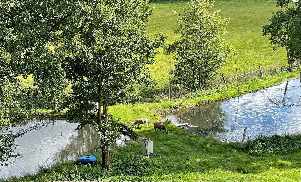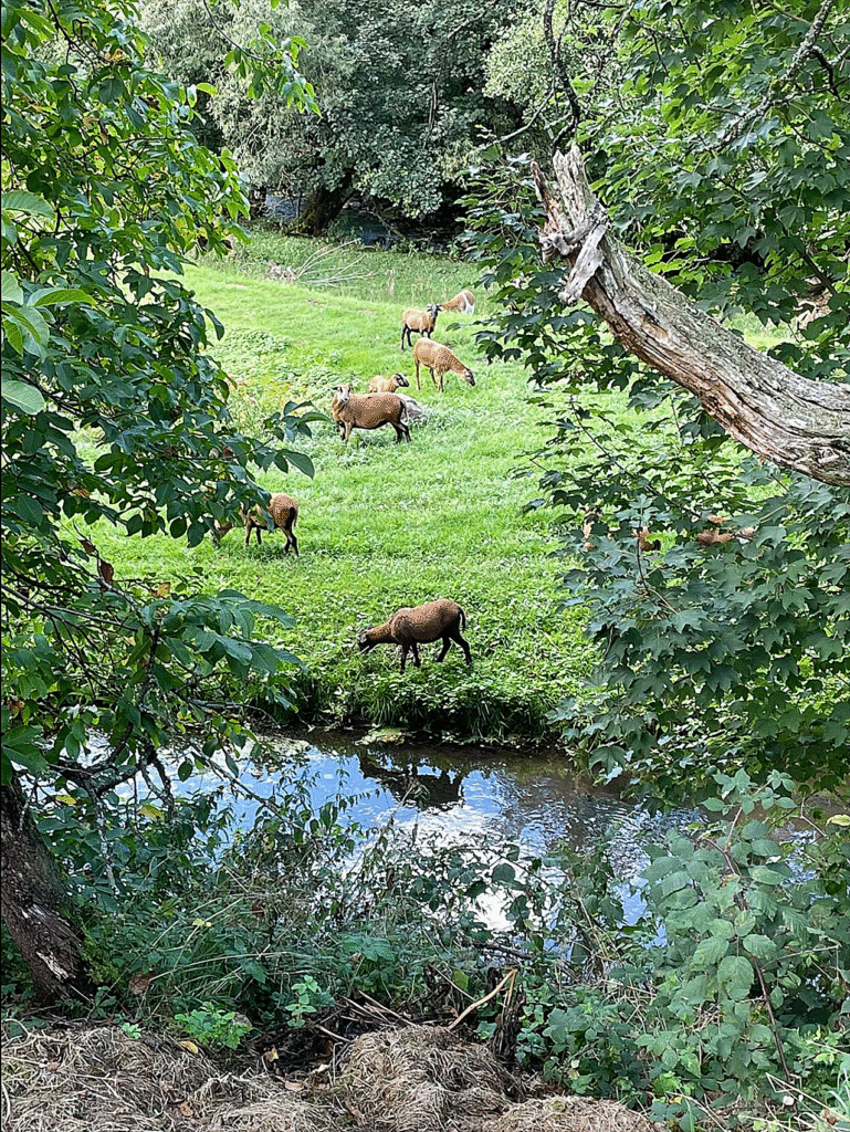 Schafe um Fischteiche in der Mitte von Riedenberg, einem unzugänglichen Feuchtgebiet, das durch den an den Wald angrenzenden Truppenübunsgplatz leicht erreicht werden kann. Keine Sicherung, gar kein Zaun am Bach. Dabei ist bekannt, dass Wölfe gut schwimmen können. Dokumentation vom 14.09.25