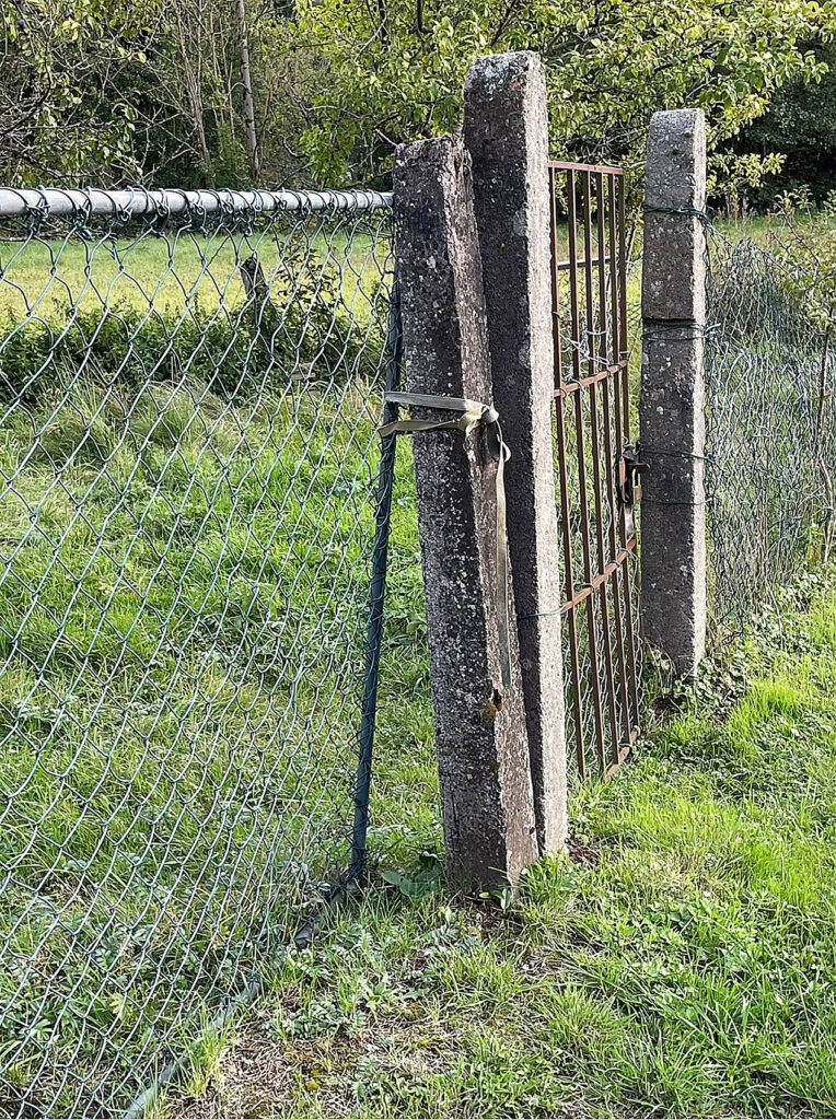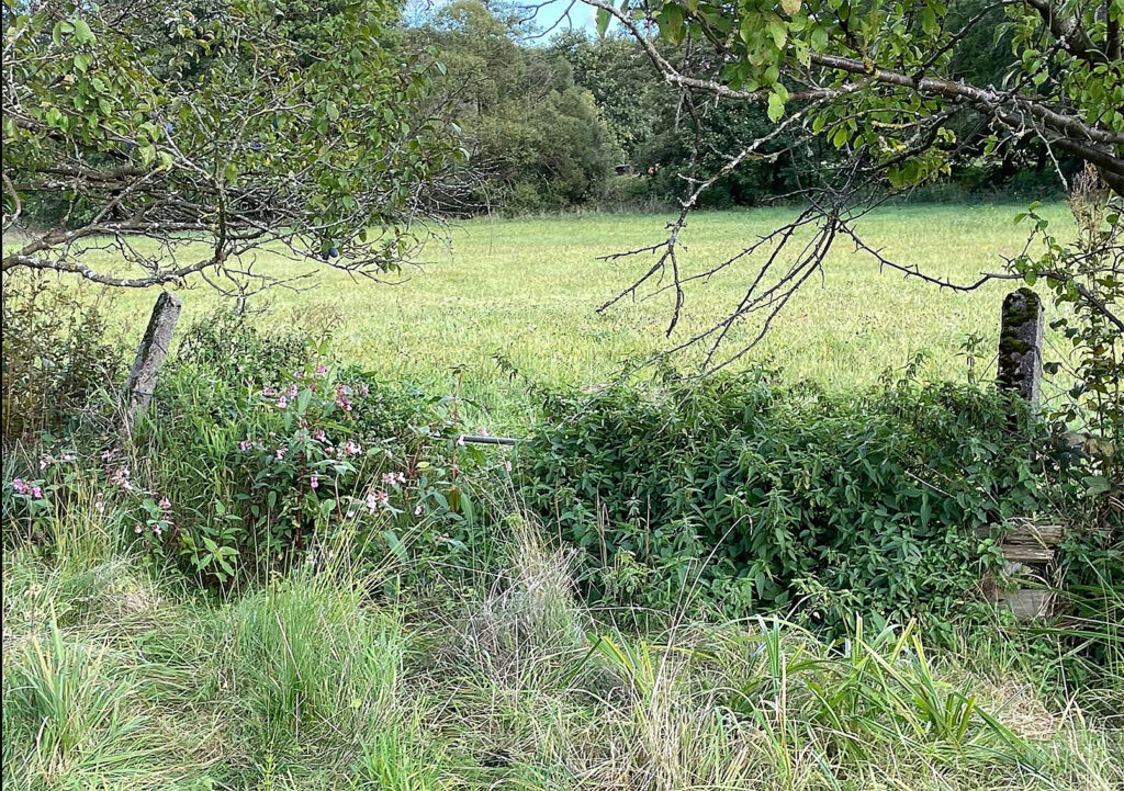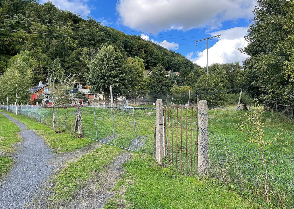 Blick zum hinteren Teil des Geländes. In der Dorfmitte befindet sich ein unwegsames Fischteichgelände, das nicht eingezäunt ist. Das Gebüsch kann als Kletterhilfe dienen, die Holzpfosten sind morsch. Dokumentation vom 14.09.25