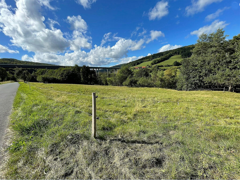 Diesen niedrigen Zaun mit nur zwei Litzen fanden wir 14.09.25 auch noch bei Riedenberg vor. Welche Tiere hier geweidet haben, können wir nicht sagen, es sind aber deutliche Spuren von Beweidung vorhanden. Falls hier Schafe darauf standen, hatten sie gar keinen Schutz.