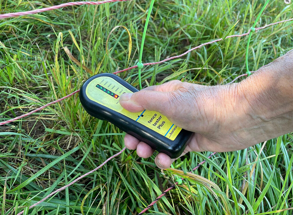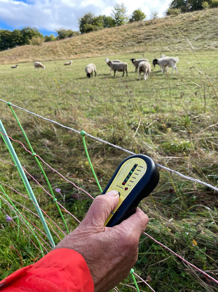 Auf Wildzaun ist kein Strom, wir messen aber dennoch immer, weil sich bei einer Messung einmal Spannung auf einem Stacheldrahtzaun befand.