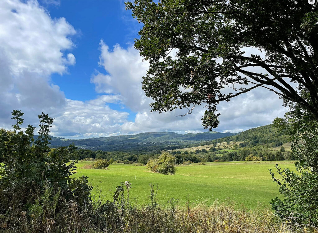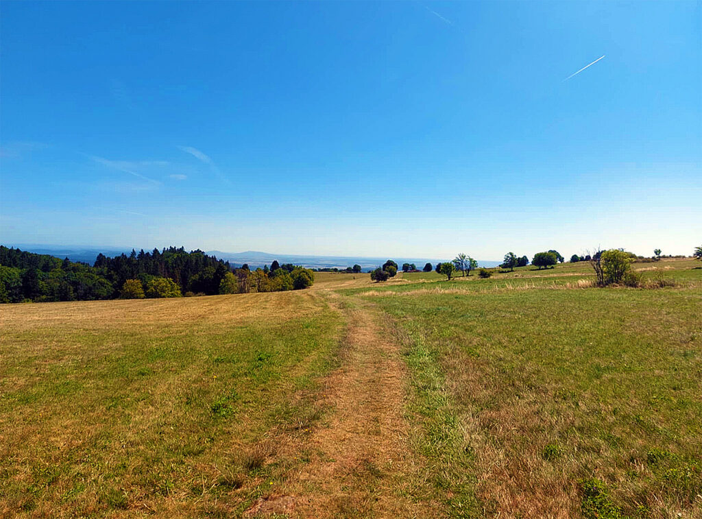 Blick aus dem Juli in die Lange Rhön, wo das Nachbarrudel „Hohe Rhön“ (Frigga) sich angesiedelt hatte. Nach unseren Daten wurde es komplett illegal ausgerottet. Das LfU führt allerdings eine Sichtung am 8. August im Landkreis Rhön-Grabfeld auf. Allerdings ohne Belege. Am 29.06.25 sollen Griso und eine Tochter aus dem Rudel Wildflecken im Landkreis Rhön-Grabfeld ein Schaf gerissen haben. Am 07.06. gab das LfU an, ein Foto mit einem Wolf betätigt zu haben. Allerdings wird dieses Foto nicht gezeigt. Nachweise zum Rudel gibt es nur bis Ende April 2025. Darunter Filme und Bilder, die aber nicht gezeigt werden sowie ein Nachweis (Genetik, Rissabstrich Wildtier) des männlichen Wolfes GW4442m (HW02) am 11.04.2025. Die Elterntiere sind GW3092f x GW3519m. (Eltern Frigga und Griso, Bruder Nuka).