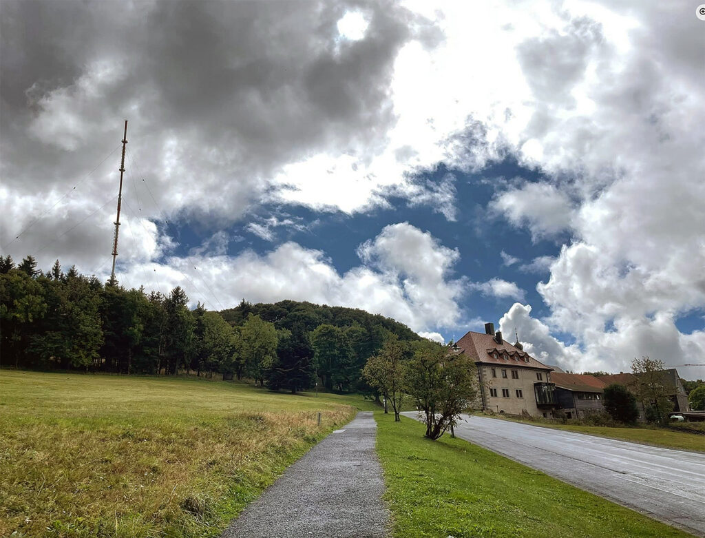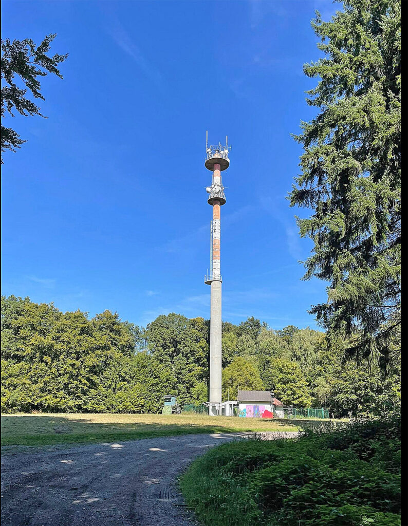 Der Sendemast Mönchberg ist umgeben von zwei Hochsitzen. Direkt gegenüber ein Rastplatz für Wanderer, die dort gefährlich pausieren. Foto vom 19.09.25
