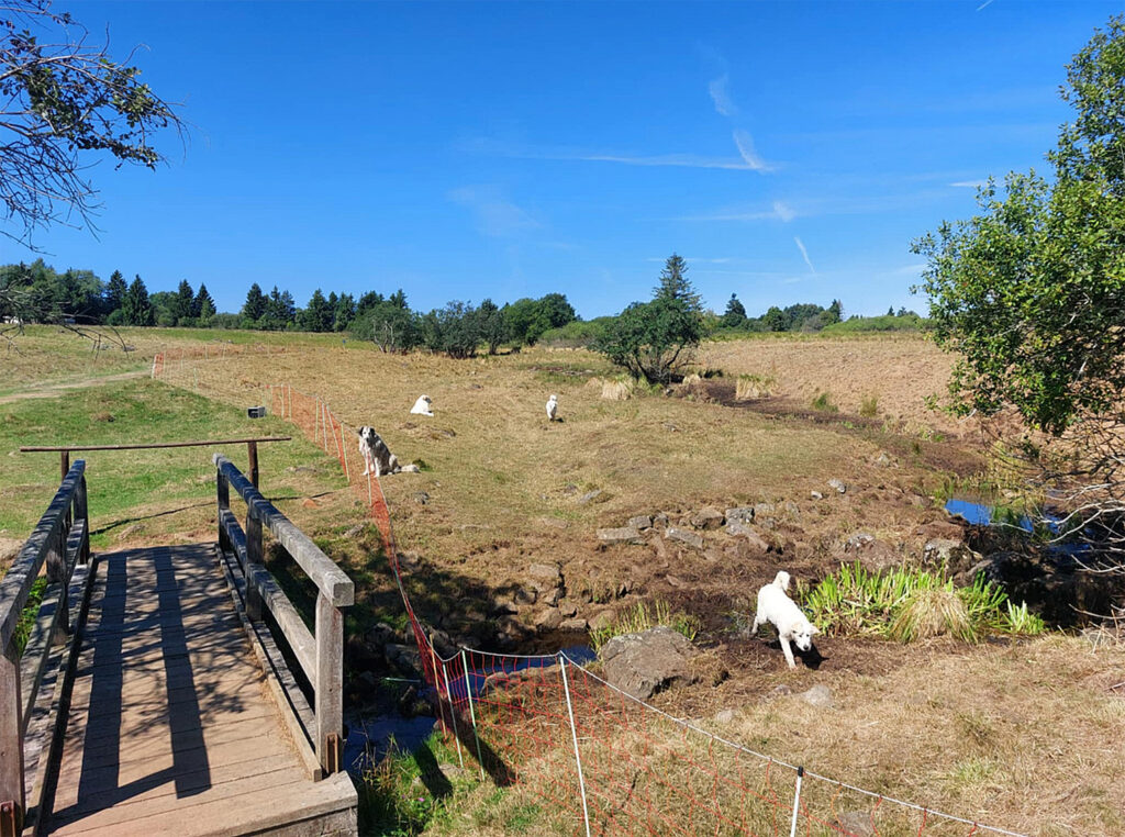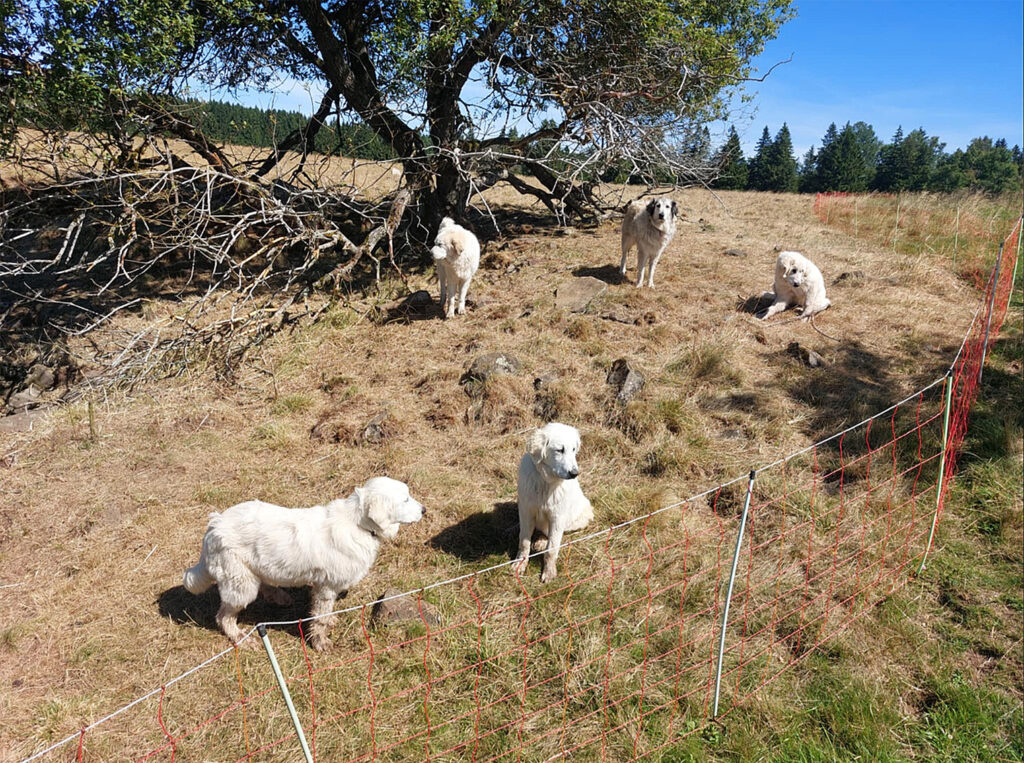 Innerhalb einer Weide waren die Schafe mit einem mobilen Netz eingezäunt und es waren Hirtenhunde dabei.
