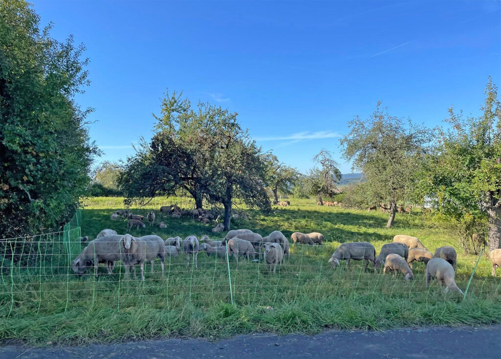 Schafe hinter einem wolfsabweisenden Netz von 1,10 Metern und 8.000 Volt bis zur unteren Ebene. Damit sind dieses Schafe gut geschützt. Dokumentiert am Kreuzberg, 14.09.25.