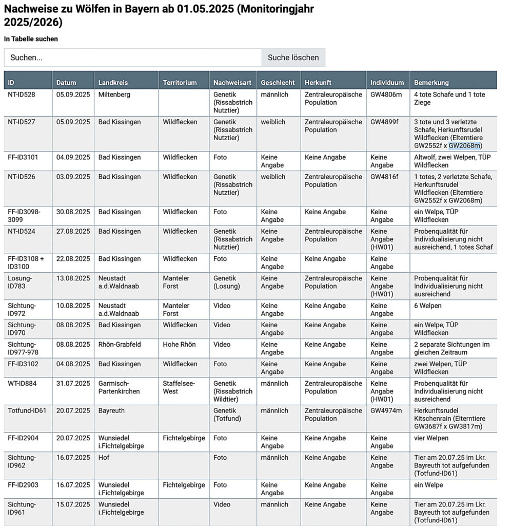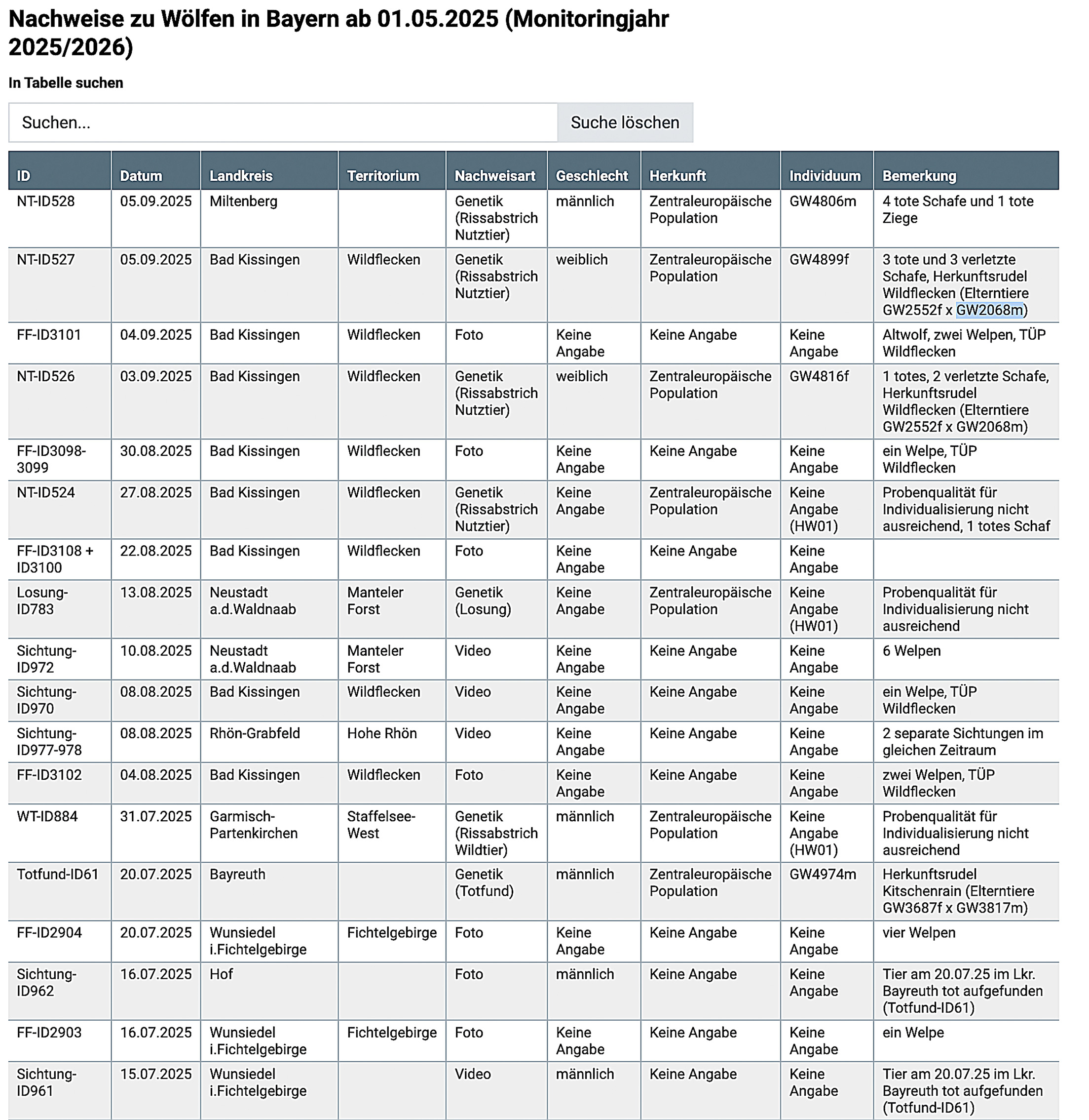 Auszug aus der Rissliste Bayern. https://www.lfu.bayern.de/natur/wildtiermanagement_grosse_beutegreifer/wolf/monitoring/index.htm