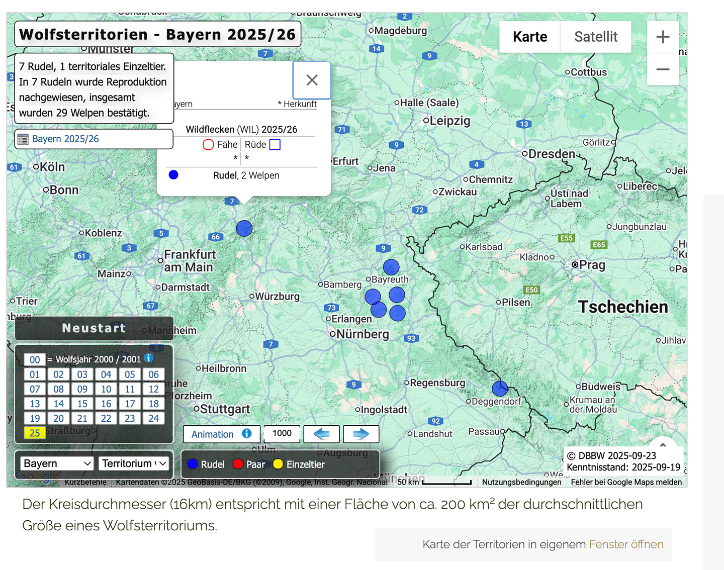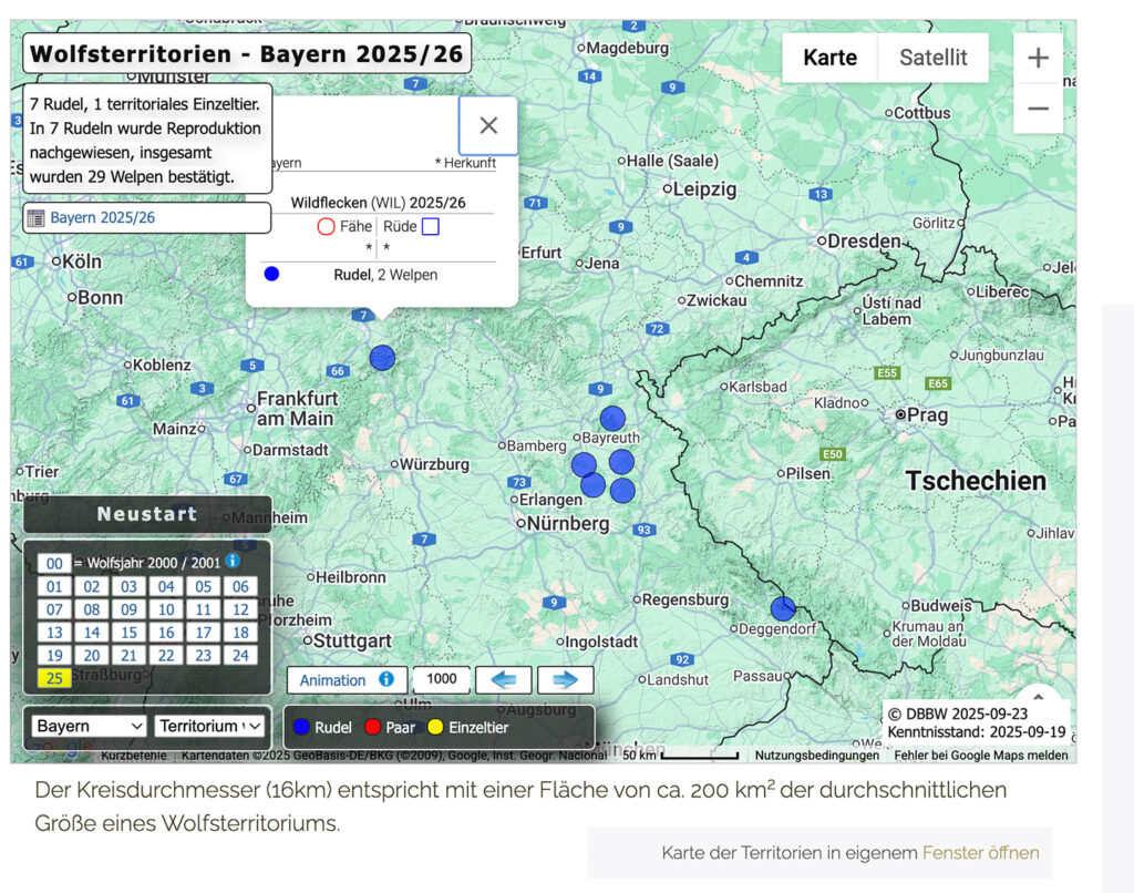 Aktueller Screenshot von DBB-Wolf. Beim Rudel Wildflecken wurden nur zwei Welpen nachgewiesen. Eine Jungwölfin von dort wurde im vergangenen Jahr „versehentlich“ auf dem Gebiet des Rudels Hohe Rhön erschossen. Sobald das Rudel den Truppenübungsplatz verlässt, wird ihm illegal nachgestellt. Vom Nachbarrudel Hohe Rhön (Frigga) gibt es keine Nachweise mehr. Dies deckt sich mit unseren Daten. Weiterhin gibt es in ganz Bayern aktuell nur Nachweise vom Rudel Fichtelgebirge mit vier Welpen, Kitschenrain mit sechs Welpen, Pressather Wald mit vier Welpen, Veldensteiner Forst mit 4 Welpen, Manteler Forst mit sechs Welpen und Bayerischer Wald Süd mit drei Welpen. Ausriss aus: http://www.dbb-wolf.de